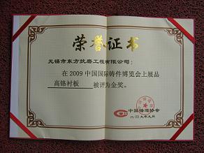 我司参加了2009年中国国际铸件博览会,举办时间:2009年9月1日-3日;举办地点:上海新国际博览中心;主办单位:中国铸造协会。我司展位:2E-F12. 我司展品高铬衬板在此届国际铸件博览会上荣获优质铸件金奖。